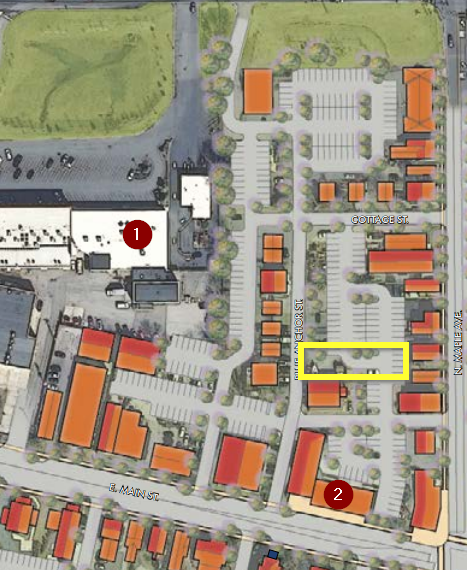 Smaller buildings like the ones above can also 'fill in' places where driveways are now. One of the other primary goals of the plan is to reduce the number of 'curb cuts' and driveways. For an example of this, we can look at the south side of Main Street in that same area.