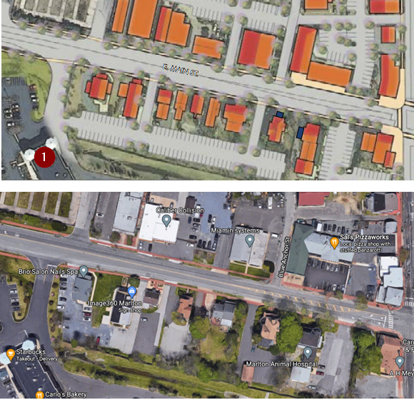 On the top photo, I've marked Starbucks with a 1 from the Vision Plan. The bottom photo is how it looks today. Again, behind the buildings is a unified parking lot with two entrances from Main Street. Currently, there are 6 curb cuts/driveways in that same area. And where driveways have been removed, new, smaller buildings have been added for additional shops.